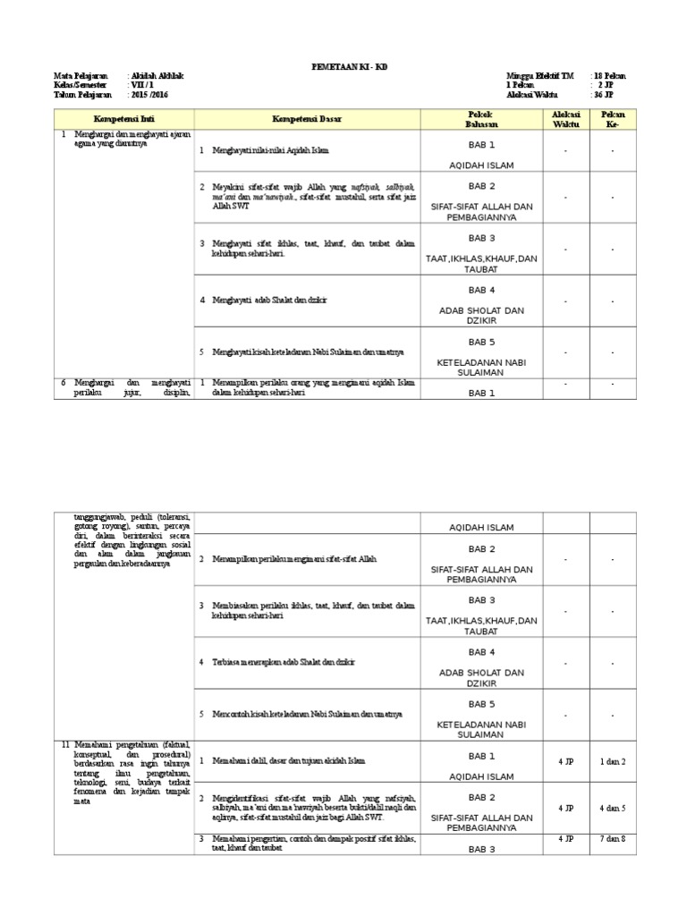 Pemetaan ki kd aqidah akhlak mts kls 7 8 9 tahun pelajaran 2019/2020. Kegiatan ujian akhir semester (uas) atau kegiatan penilaian akhir semester (pas) yang kemudian juga dikenal dengan istilah. Akidah akhlak mi kelas 1 semester ganjil. Akidah akhlak mts kelas 8 semester gasal kompetensi inti 1 (sikap spiritual) kompetensi inti 2 (sikap sosial) kompetensi inti 3 (pengetahuan) kompetensi inti 4 (keterampilan) 1. Kompetensi inti (ki) dan komptensi dasar (kd) menjadi tingkat kemampuan untuk mencapai standar.