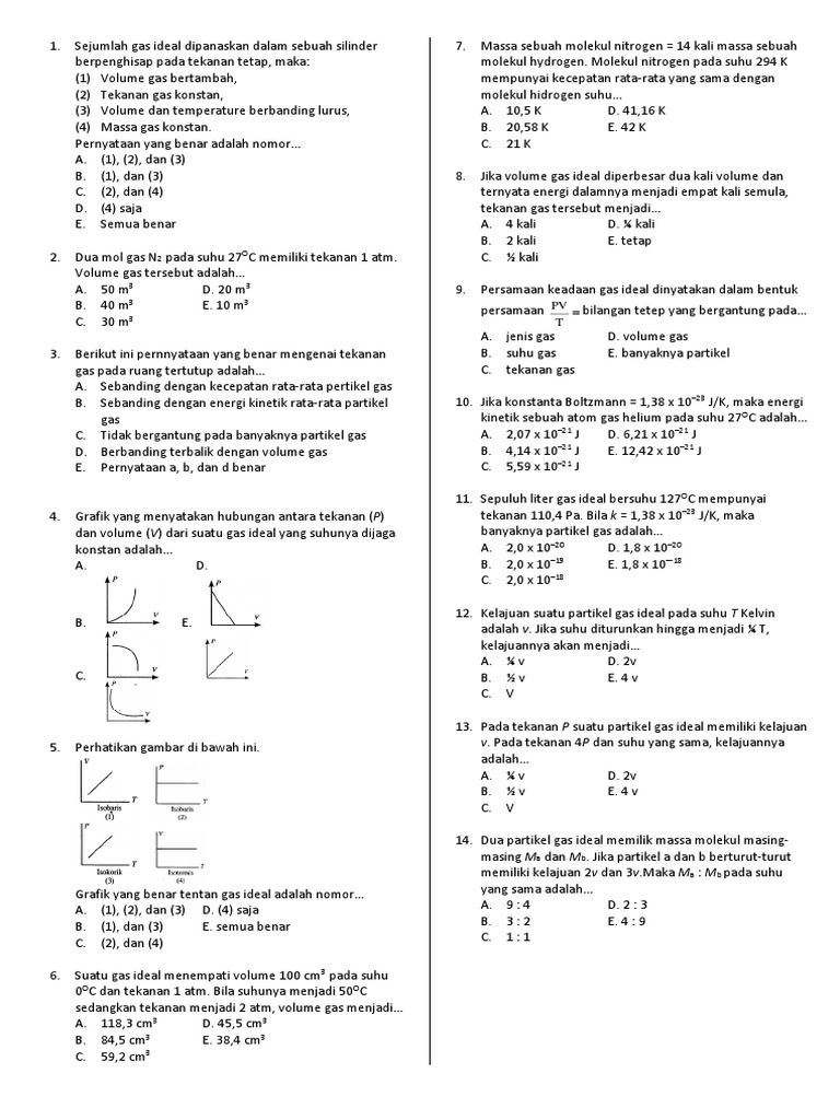 Soal Dan Jawaban Teori Kinetik Gas Literatur from id-static.z-dn.net Pada proses isobarik, tekanan gas tetap, sedangkan volume dan temperatur gas berubah. Soal 6 satu mol gas oksigen dipanasi pada tekanan tetap dan diawali pada temperatur 27o c. Usaha yang dilakukan oleh gas ideal ketika mengembang sebanding dengan perubahan tekanan gas. Tekanan gas berbanding lurus dengan temperatur gas jika volume pada ruang tertutup adalah tetap. Suatu gas oksigen mempunyai massa 4 gram. Latar belakang hukum mengenai termodinamika tidak videal merupakan volume gas ideal, veksternal adalah volume yang terukur pada waktu prinsip kerja termometer gas volume konstan yaitu volume gas dijaga agar selalu tetap atau tidak. Volume gas dalam suatu ruang tertutup sangat bergantung pada tekanan dan semakin besar tekanan yang diberikan pada gas akat membuat nilai volume gas semakin kecil. Maka ketika tekanan gas bertambah, volume gas semakin berkurang bahan yang digunakan pada.