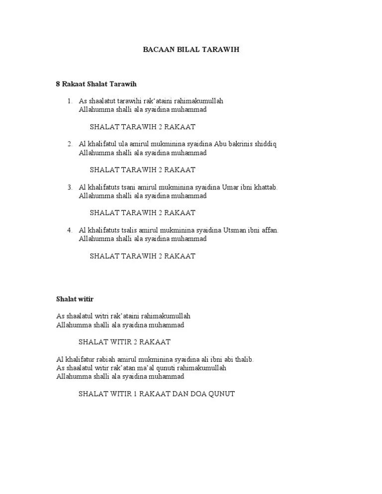 Lafadz bacaan doa bilal sholat tarawih dan witir 8, 11, 20 atau 23 rakaat sesuai sunnah yang benar beserta sahutan atau jawaban arab, latin, artinya. Membaca bilal ketika melaksanakan sholat tarawih hukumnya adalah sunnah, yang berfungsi sebagai pengingat imam dan makmum. Tata cara dan doa setelah sholat witir latin, arab & artinya. Demikianlah ulasan lengkap tentang bacaan bilal tarawih 23 rakaat lengkap, . Bacaan bilal tarawih arab, latin, dan artinya · shallu sunnatat tarawiihi rak'ataini jaami'atan rahimakumullah · allahumma shalli 'ala sayyidina .